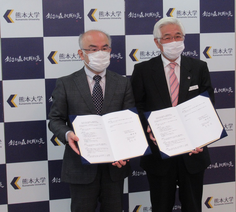 協定書を掲げる宮尾常務理事(右)と八幡教育学部長?教育学研究科長(左)